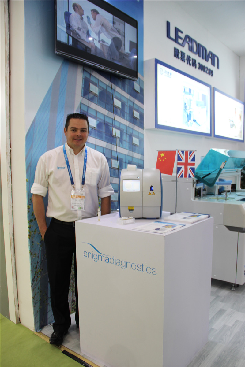 在分子诊断方面,会上展出了Enigma Mini-lab全自动化分子检测平台。Enigma ML是POCT应用和分子诊断技术的完美结合。资深工程师James Wood为到场观众详细讲解了其诸多优点:此款完全自动化的PCR反应系统可广泛应用于临床实验室、重症监护及外科手术室、疾控中心实验室和流行病学研究等多种领域。该系统结合了实时荧光PCR反应的高灵敏度、高特异性和POCT类产品检测快速、简易的特点,将反应所需的全部试剂预装入一次性卡架内进行操作,免去了之前PCR产品费时费力的样本核酸提取和其它操作过程。数据的输入和设定可通过触摸屏来简单操作,检测报告由一部内置打印机输出。所有检测结果实时加密上传云端。Enigma ML系统可以在不同的医疗健康项目需求下提供灵活配置,它的出现颠覆了原有分子诊断产品需要专属实验室以及专业操作人员进行操作的概念,Enigma ML产品完全可以实现在任何非实验室条件下的正常使用,对操作者无需任何专业要求,是POCT分子诊断领域毋庸置疑的领导者。